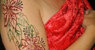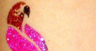 Glitter Body Art is applied using hypo allergenic cosmetic adhesive and cosmetic polyglitter, either freehand or using a wide selection of stencil designs.