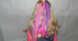Funky hair is attached using hairgrips, so is easily removable for re-use in the future.